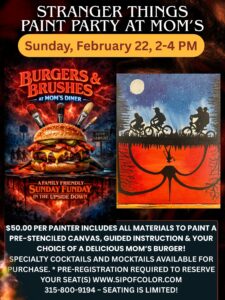 Join us for a Family Friendly- All Ages Welcome ~ Stranger Things Paint Party at Mom’s Diner on Sunday, FEBRUARY 22, 2026 for a