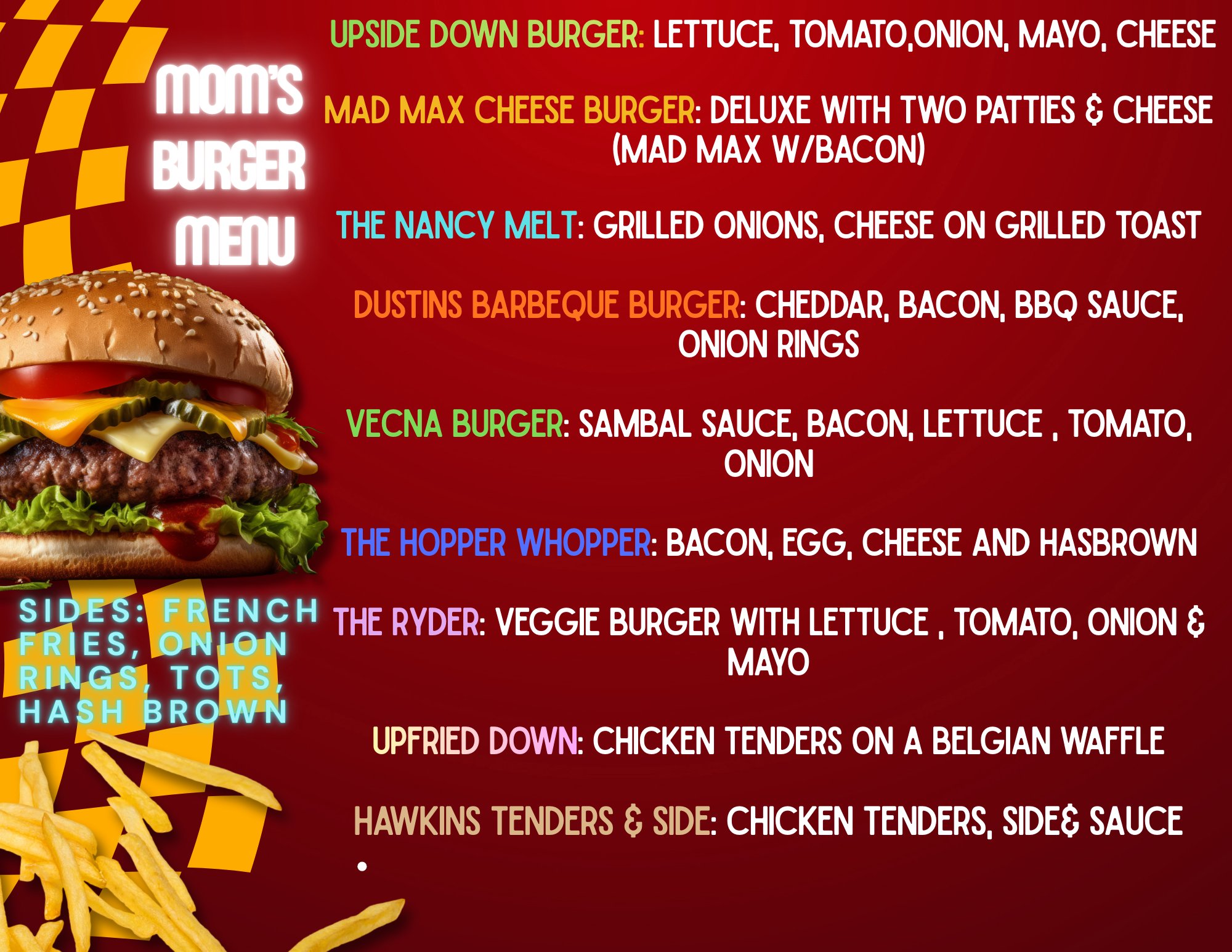 $50 per painter includes all materials to paint a pre-stenciled “Stranger Things” 16×20 canvas with guided step-by-step instruction from local art teacher, Katie and a delicious Mom’s Burger of your choice.