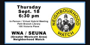 WNA/SEUNA Neighborhood Watch next meetsĀ  for an in-person session (with an option for sitting in virtually), Thursday,September 18, 2025, starting 6:30 pm, at Petit Branch Library.