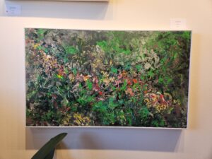 Garden” is a large, vertical work with an array of colors. In contrast, “Morning Mist” works off