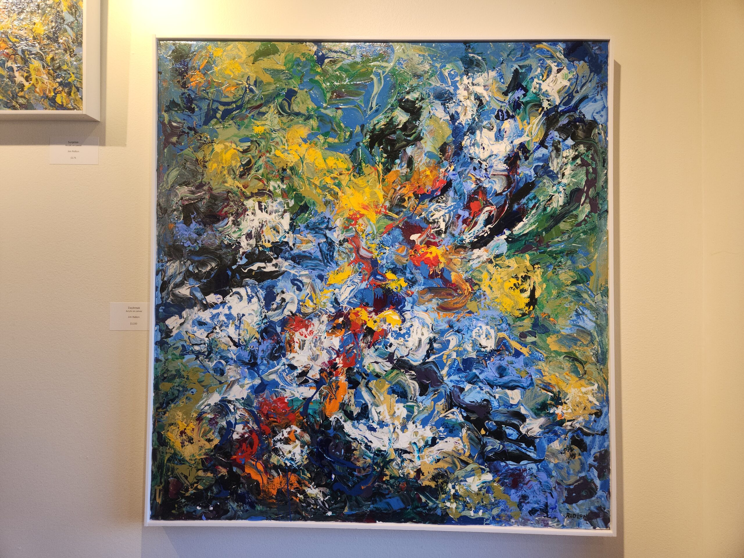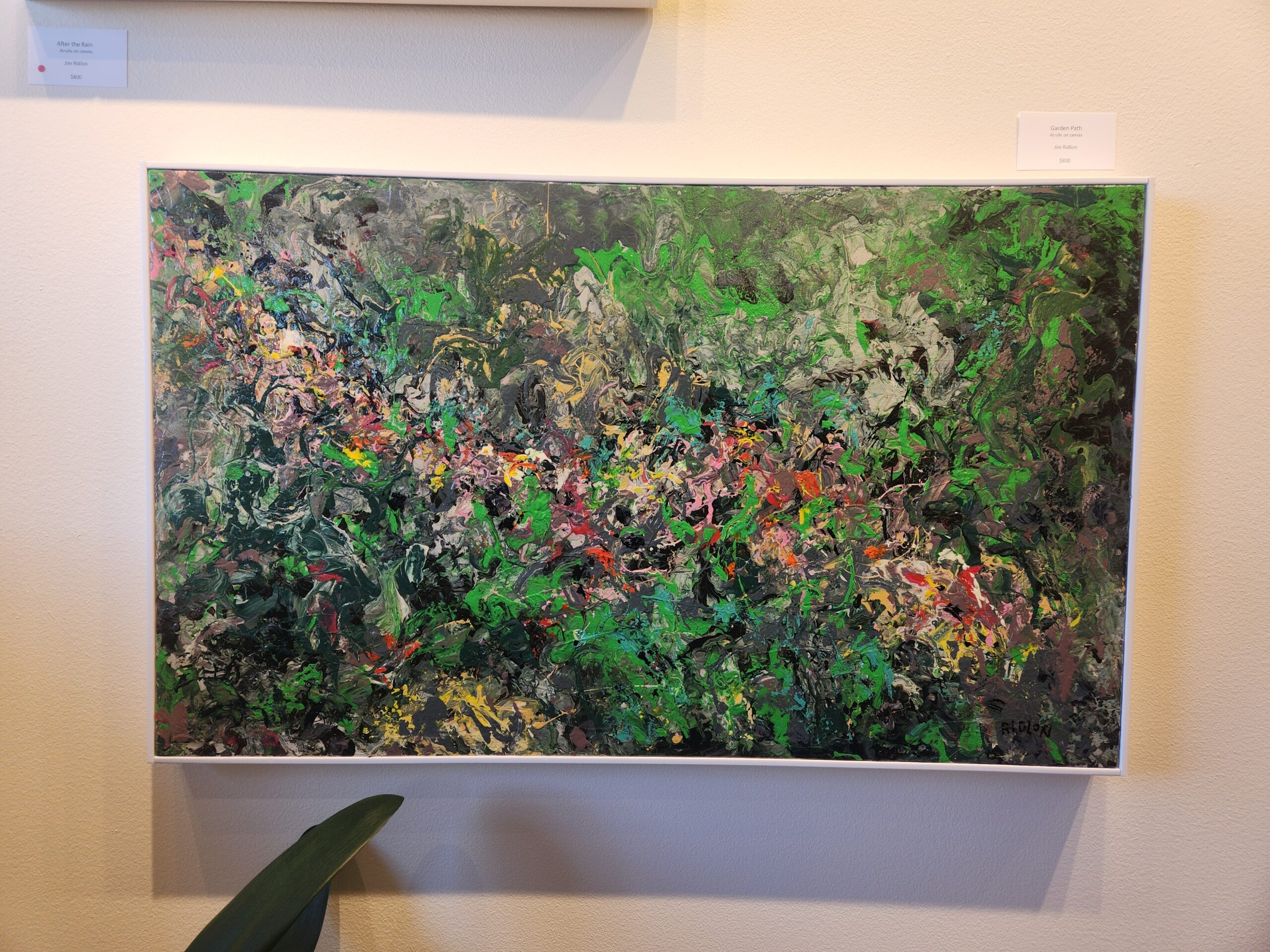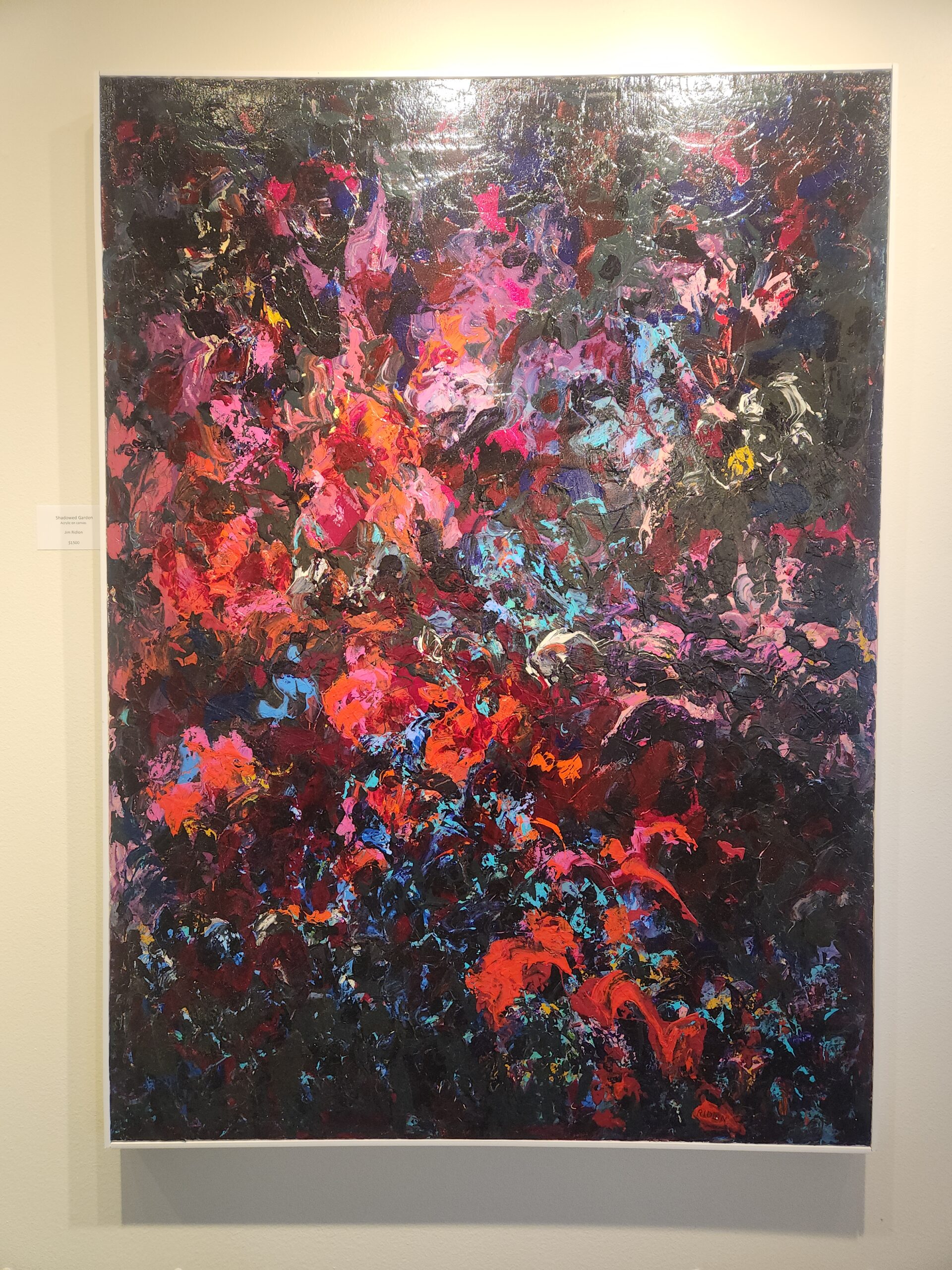 Garden” is a large, vertical work with an array of colors. In contrast, “Morning Mist” works off
