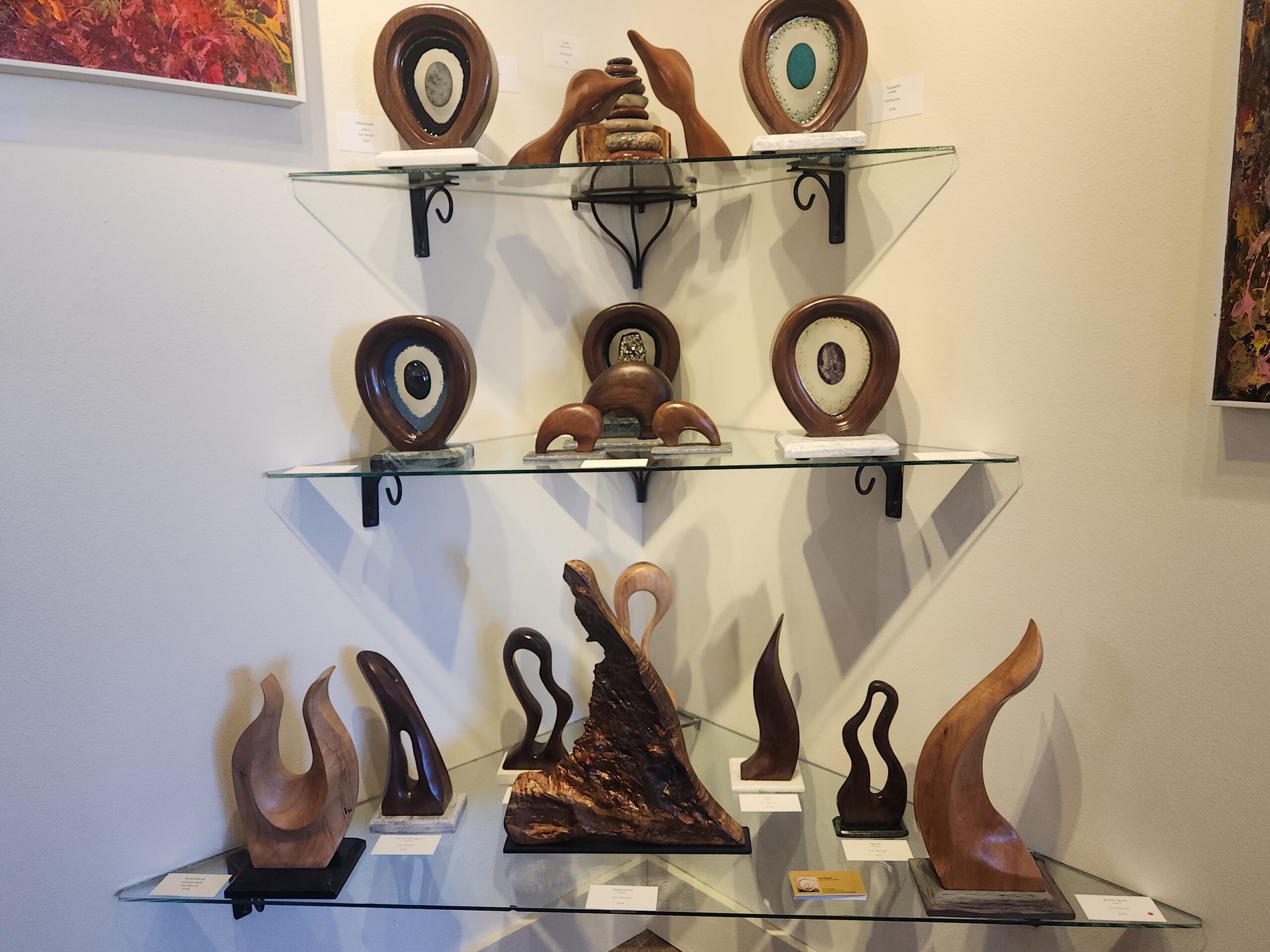 The sculptor also merges wood and stones, inserting red jasper into walnut or jade into another