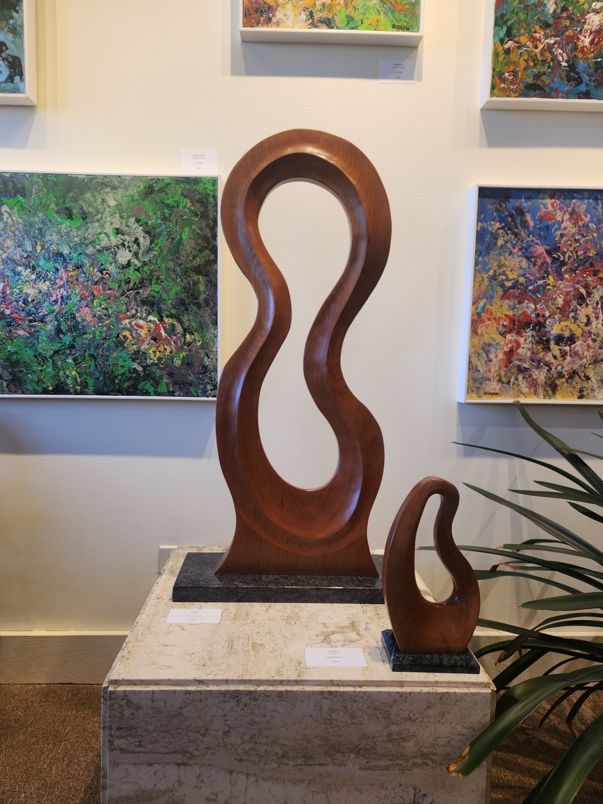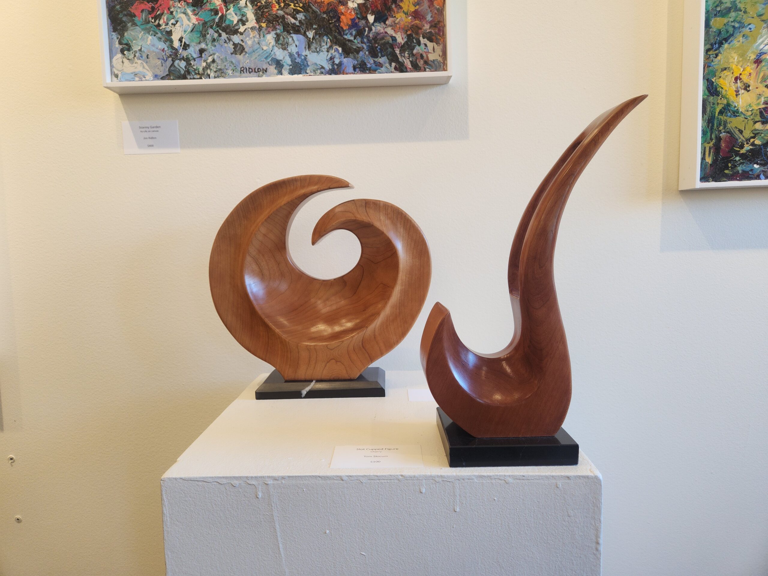 Slocum, meanwhile, makes organic wood sculptures like “Back Roads.” Fashioned from